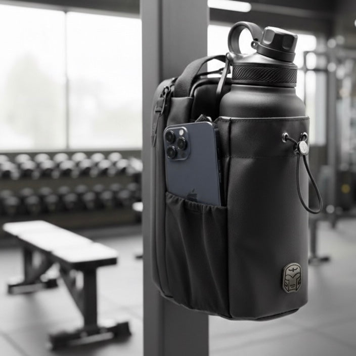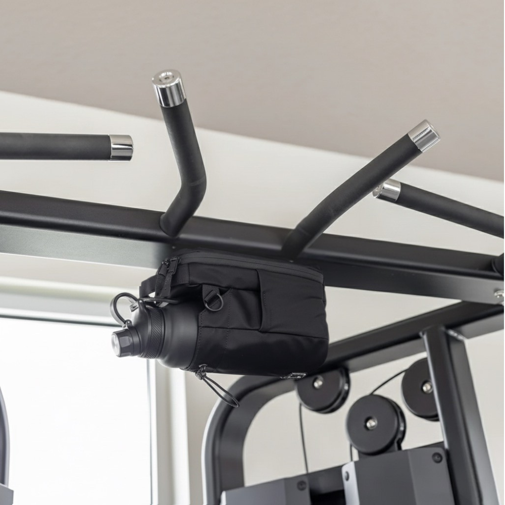 Holds bottle, phone, and towel in one place
