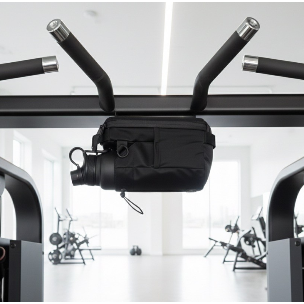 Holds bottle, phone, and towel in one place